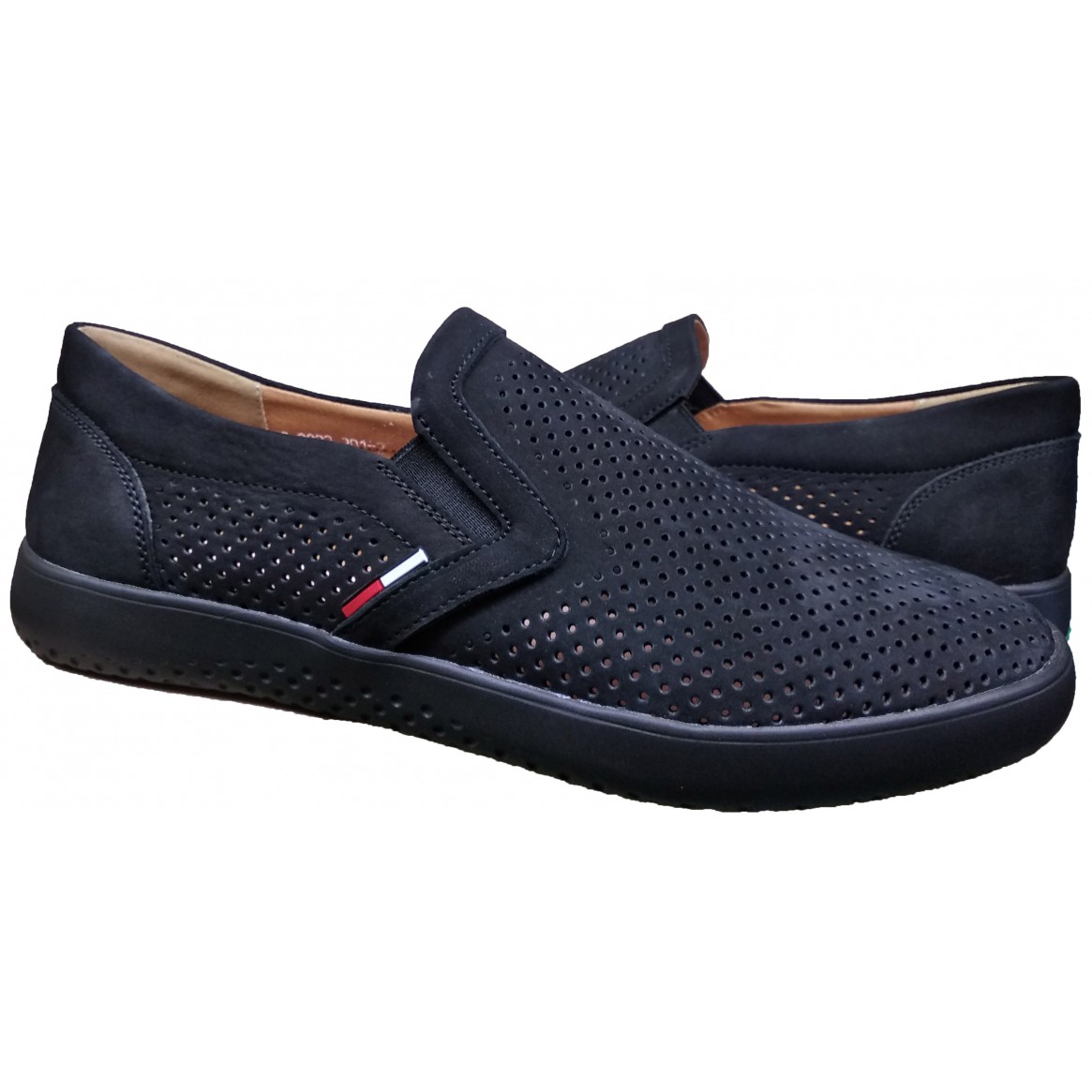 Виготовлені з натуральної шкіри нубук чорного кольору, перфоровані з підкладкою, підошва полегшена, поліуретан, на гумці, що робить зручне взуття та зняття, формована ортопедична устілка,