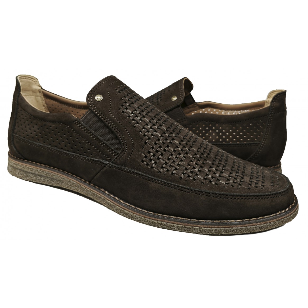 Туфлі виготовлені з високоякісного нубуку, коричневого кольору, перфоровані з підкладкою, на гумці, гумова підошва, устілка формована. вкладна.