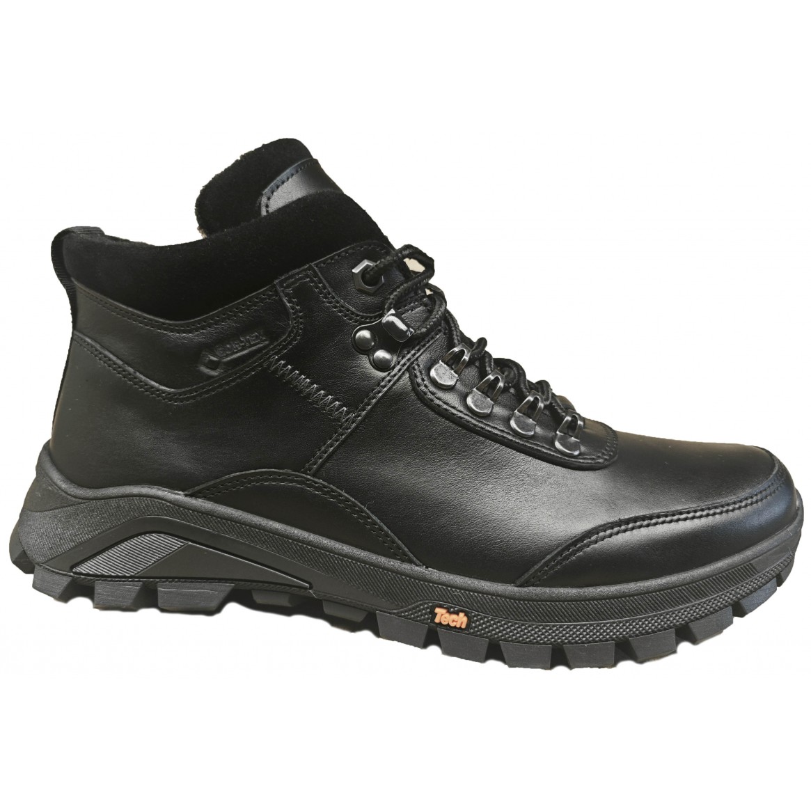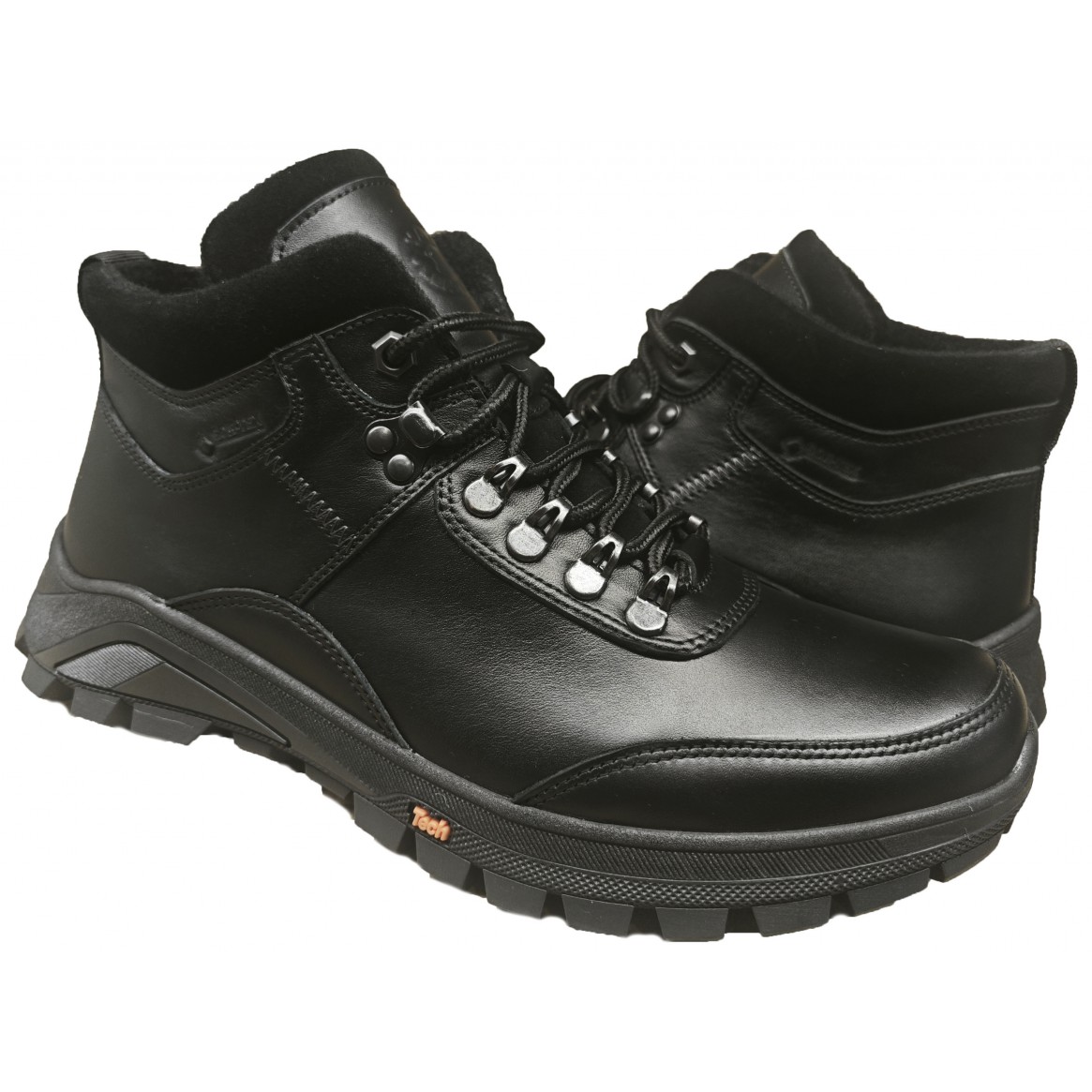Чоловічі зимові черевики 2525 black front, виготовлені з натуральної лицьової шкіри чорного кольору, що дає тривалу експлуатацію в суворих зимових умовах, підошва термопластична гума ТЕП, впевнено веде себе на слизьких поверхнях, не промерзає, утеплювач набивне хутро 100%,  знімна. Комбінація змійки та шнурків робить швидким та зручним взуття даної моделі.