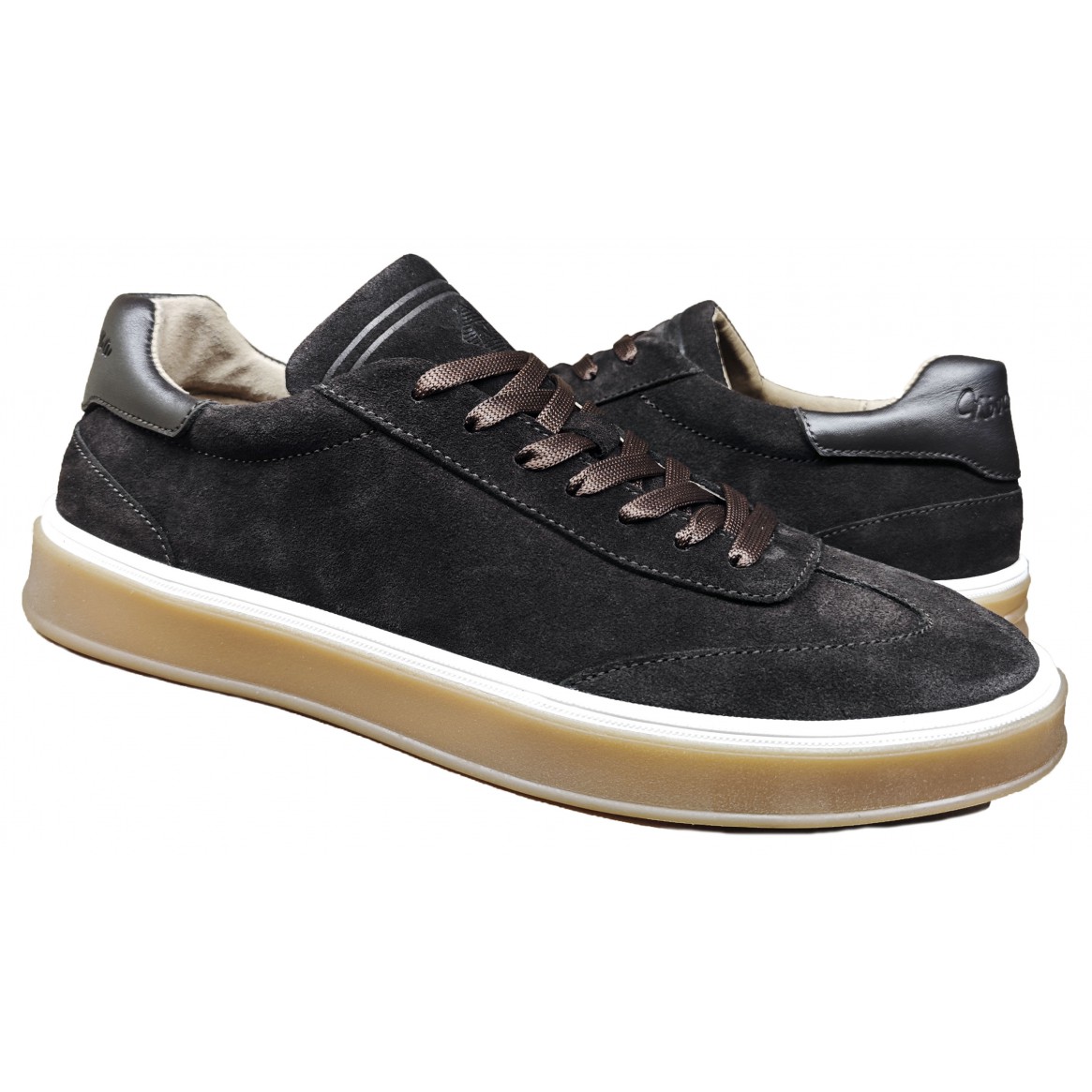 Кросівки виготовлені з натуральної замші коричневого кольору, всередині стоїть дихаюча підкладка, гумова підошва з білою губою надає особливий стиль цієї моделі, на шнурку, вкладна ортопедична устілка.
