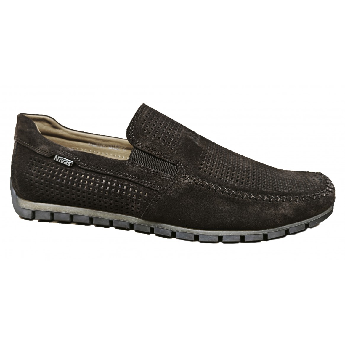 Мокасин виготовлений з натуральної шкіри замша, коричневого кольору, перфорований з підкладкою, стійка гумова підошва, повномірний розмір колодки забезпечує зручне взуття та комфортне носіння на кожен день, на гумці, формована ортопедична устілка, поєднання стилю та якості.