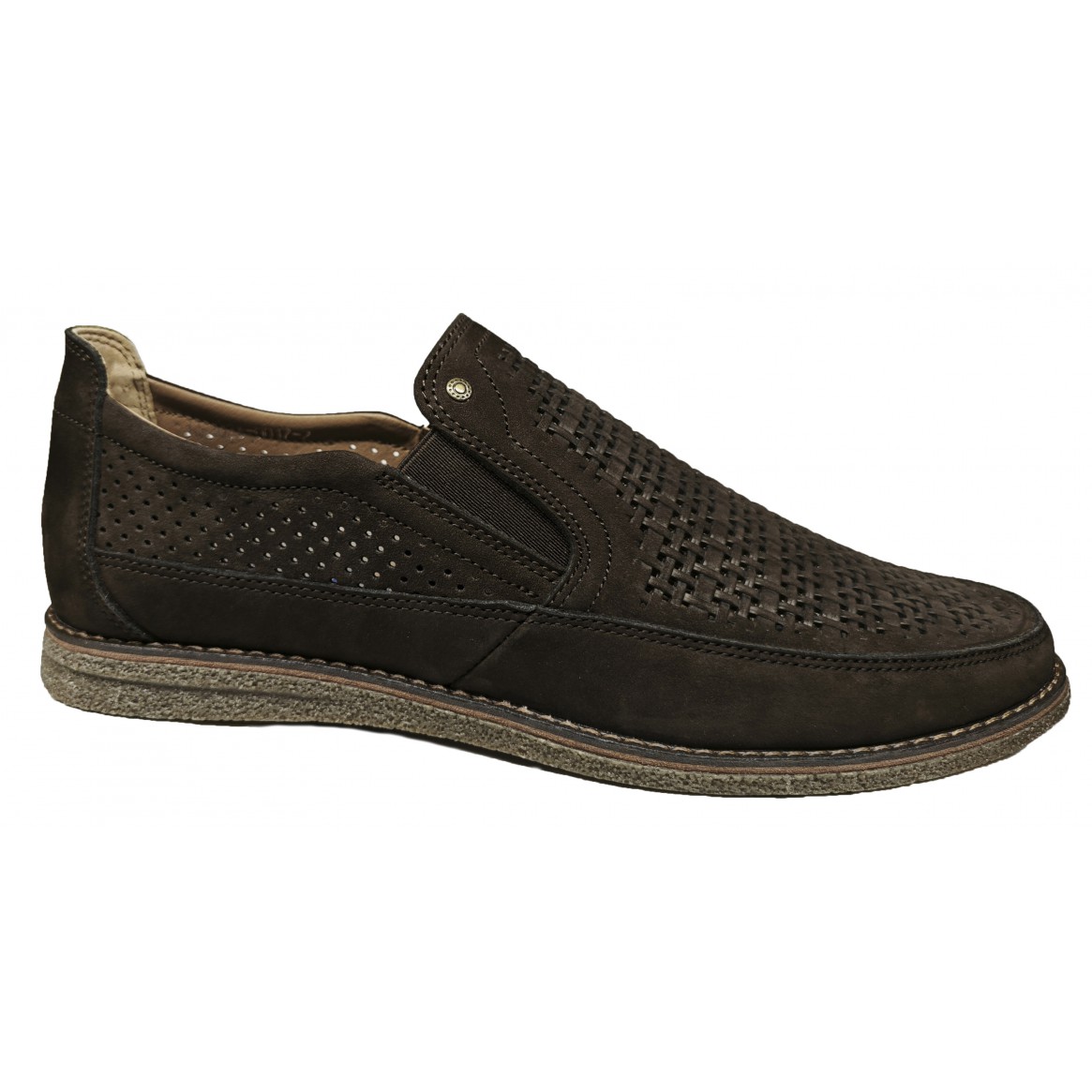 Туфлі виготовлені з високоякісного нубуку, коричневого кольору, перфоровані з підкладкою, на гумці, гумова підошва, устілка формована. вкладна.